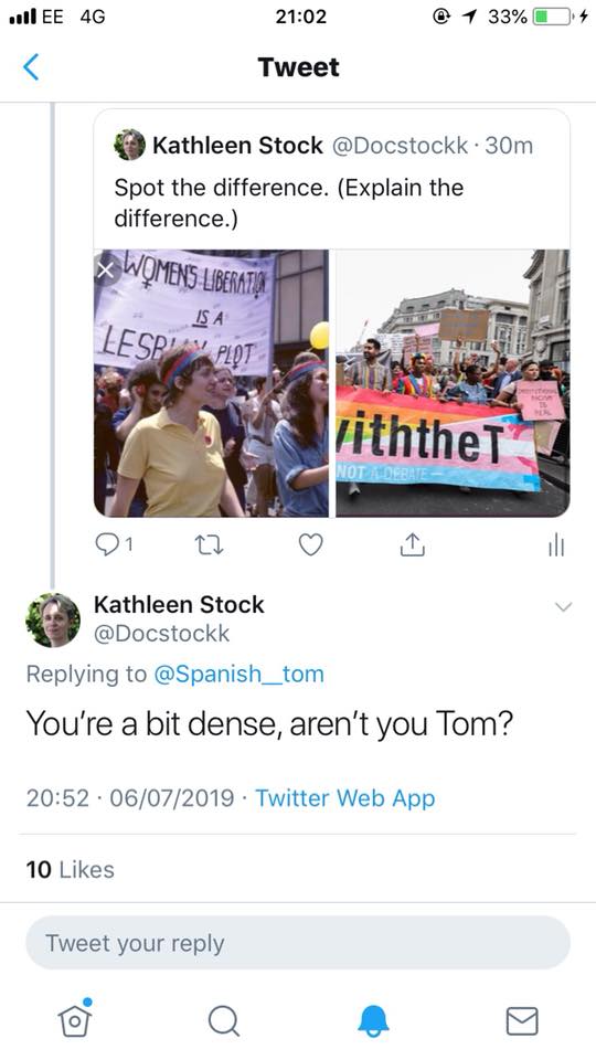 This year the focus for London pride was ‘L with the T’ highlighting the support for Transgender people from lesbians and everyone across the LGBT community. I should say that I’m a cis guy and I can’t speak for trans people or say what it’s like to be trans. All I can do is share what I’ve learnt from my trans friends and the experiences and feelings that they’ve told me about. I’ve seen first-hand the effect of gender dysphoria on mental health, and I’m often saddened by the inordinate waiting times that transgender people have to wait to access even basic healthcare. Shockingly, transgender hate crimes have soared by 81% over the last year (according to a freedom of information request made by BBC news) and there seems to be a rise in the number of TERFS (Trans exclusionary radical feminists) spouting their ‘gender critical’ thought. I find it abhorrent that you could hate someone for a feeling that they can’t control. A feeling that has made some of my friends attempt suicide and it’s ridiculous that some people and even sections of the LGBT community can think that trans people are any different from anyone else. That said, it’s important not to lose sight of and ignore the struggles that many trans people go through in a blanket attempt to make people feel ‘normal’ (if normal is even a thing). I had the pleasure of interacting with one such TERF, Dr Kathleen Stock, who happens to be a philosophy lecturer at my university (Hi Kathleen it’s dense boi again!) I don’t want to name call or label anyone and I rarely engage with blatant hate speech on the internet but seeing the impact that her comments and attitude have had on my trans friends and fellow students (and quite drunk on the train home) I felt compelled to talk to her. She posted two pictures comparing the ‘L with the T’ campaign (featured at the top of this post) with a 70s campaign claiming that women’s rights were a lesbian plot and seemingly suggested that the two were one and the same (trans women can’t be feminists, huh?). Whilst my first reaction, and I’m sure yours too, will be that this is seemingly ridiculous, it struck me that people like Kathleen seem to believe that there’s some hidden ‘trans agenda’ and transgender rights and women’s rights can’t go hand in hand. This is obviously not the case and I was confounded by her response to my question asking her to explain the meaning behind her post. Her only reply was ‘You’re a bit dense aren’t you Tom’ which I can only assume referred to her perception of my intelligence, despite having never met me. She has since deleted that tweet. It’s sad that someone who so often plays the victim and argues for free speech and academic freedom of expression couldn’t even bring herself to debate me or bring up any kind of valid argument to back up her opinion and instead resorted to attempting to insult me. Of course, she’s not the victim of anything other than her own hypocrisy and I feel like I should call her out on her hypocrisy and very calculated game that she fails to play. If by some chance she ever ends up reading this, I’m sure there’d be a queue of people stretching from the University of Sussex down to the Old Steine who would be willing to debate her in a sensible and reasoned manner and they’re all probably a sight less dense then I apparently am . Either way, the rise in transgender hate crimes has reminded me of the way in which pride first began – as a protest – and I’m aware that whilst we’ve come so far we still have a long way to go on so many issues in the LGBT community. It was heart-warming to see so many charities and positive LGBT organisations such as Mermaids, Gendered Intelligence, Samaritans and others taking part in the parade and I hope that this can only increase in future years as we deal with the renewed attacks on the LGBT community.