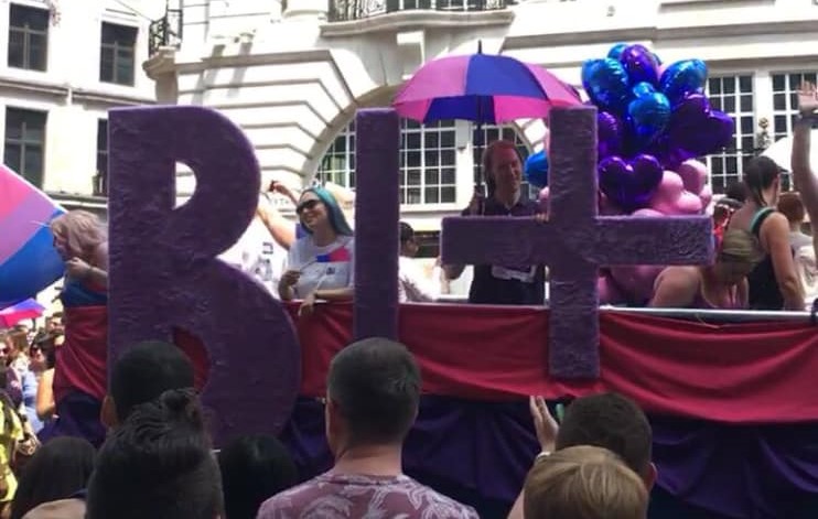 Bi+ sign on a float in deep purple. Seen at London pride 2018 it symbolises the fluid nature of bisexuality and emphasises non-binary inclusivity.
